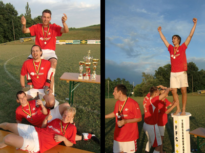 WAHNSINN! Absolut. Eigentlich unbegreiflich. Ich hab bisher nicht verstanden, wie man ein Turnier gewinnen kann. Ea muss soviel passen und richtig laufen, in unserem ersten Jahr hat Schwarzau das Turnier in Trössengraben gewonnen. Damals hatte ich extremen Respekt vor deren Leistung (da waren wir noch nicht mit dabei bei den Schwarzauern). Vor zwei Jahren hab ich den Sieg des frisch gegründeten FC Zerlach erlebt und mich einfach nur gewundert wie so was gehen kann. Ein solches Turnier zu gewinnen, bei dem 18 Mannschaften um den Sieg kämpfen, über drei Tage verteilt, mit Vorrunde, Zwischenrunde und Platzierungsspiel am Ende. Vor ein paar Jahren dann unser erster Turniersieg beim Kleinfeldturnier des SV Wolfsberg. Da hat man dann das erste Mal gemerkt, dass wir so schlecht nicht sind und dass es einfach passieren kann. Es sind so Tage, da läufts einfach. Irgendwer ist einfach gut drauf und macht die wichtigen Tore (ganz kurz vor Schluss oder ein weiter Einwurf wird per Schulter ins Tor befördert oder solche Sachen halt, die an anderen Tagen einfach nicht passen), alle anderen laufen wie verrückt und sind bissig und machen hinten dicht, die Auslosung lost „angenehmere“ Mannschaften in die Gruppe, der Schiri ist ein alter Bekannter - alles Dinge, die einfach passieren, an Tagen, an denen es einfach passt und an denen dann vieles möglich ist.