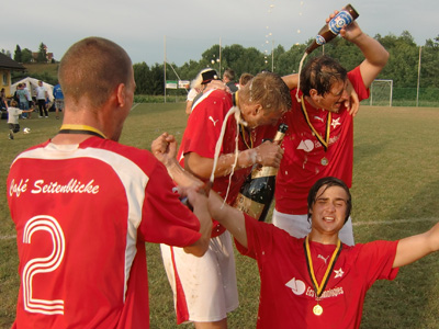 Kann mir nicht vorstellen, dass schon mal so viel Bier „verschüttet“ worden ist (wenn grad kein Sekt vorhanden ist - auch Bier schäumt und spritz fantastisch). Kabinenparty bei kaltem Wasser, alles egal - Siegerparty mit tollen Jungs vom SV Schellauf, die uns als einzige Mannschaft (in der Vorrunde) besiegt haben und mit ihrem Unentschieden im letzten Vorrundenspiel wesentlich an unserem Aufstieg beteiligt waren. Aber an Tagen wie diesen passiert das halt genau so - und dann feiert man zusammen. Die Jungs haben uns mit Bier geduscht und wir sind ihnen nichts schuldig geblieben.